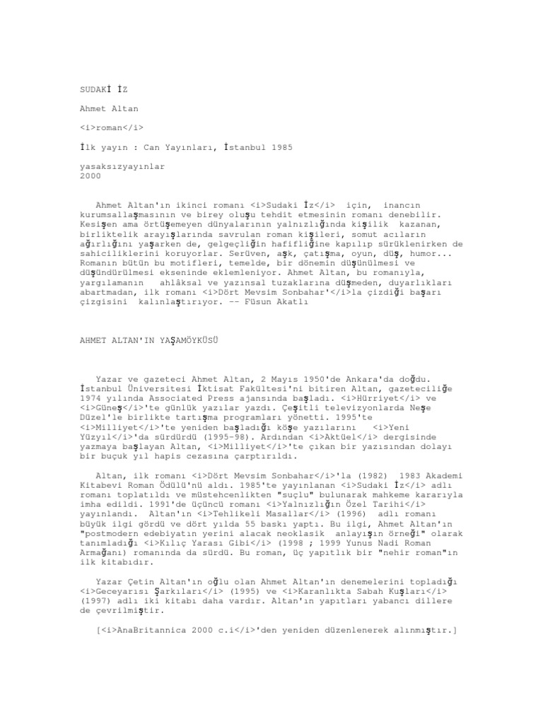 Ahmet Altan Sudaki Iz - Niyazi Icinde Ikinci El Satilik Sudaki Iz Ahmet Altan U - İlk kez ahmet altan kitabı okudum.. 0 evaluări0% au considerat acest document util (0 voturi). Ahmet altan ın ikinci romanı olan sudaki i̇z, ilk kez 1985 yılının ortalarında can yayınları arasında çıkmıştır. Büyük bir ilgiyle karşılanan roman, yedi ay gibi kısa bir süre içinde üçüncü basımına ulaşmıştı. Bu son basımın üzerinden iki ay geçtikten sonra kitap toplatıldı. Killi bir toprak tabakası gibiydi içi;